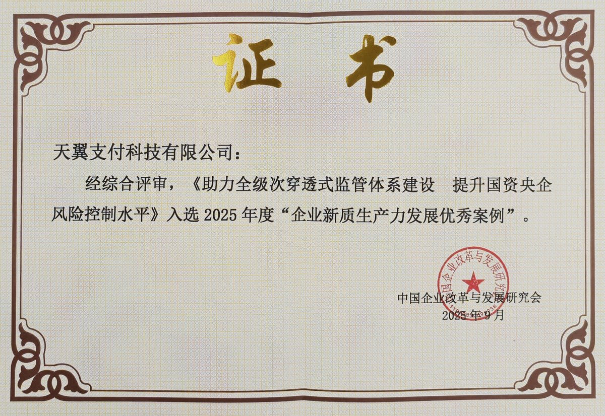 近日,中国电信翼支付凭借《助力全级次穿透式监管体系建设,提升国资央企风险控制水平》案例,成功入选中国企业改革与发展研究会评选的2025年度“企业新质生产力发展优秀案例”。
